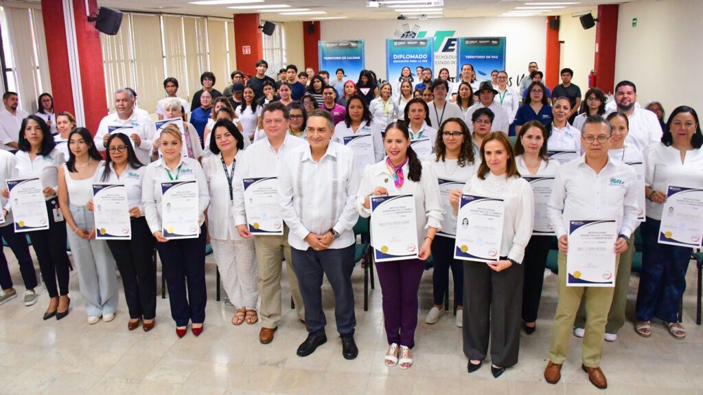 En este sentido, se realizó la entrega por parte de la titular del sector educativo de la entidad, Karla Aline Herrera Alonso, de 27 Diplomas a directivos, maestras y maestros y personal administrativos que concluyeron en el Diplomado “Educación para la Paz” impartido por Instituto para la Paz con el objetivo de que este equipo pueda ser parte del proyecto Promotores de Paz “Guardianes del Nido” y con ello, abonar a la reconstrucción del tejido social.