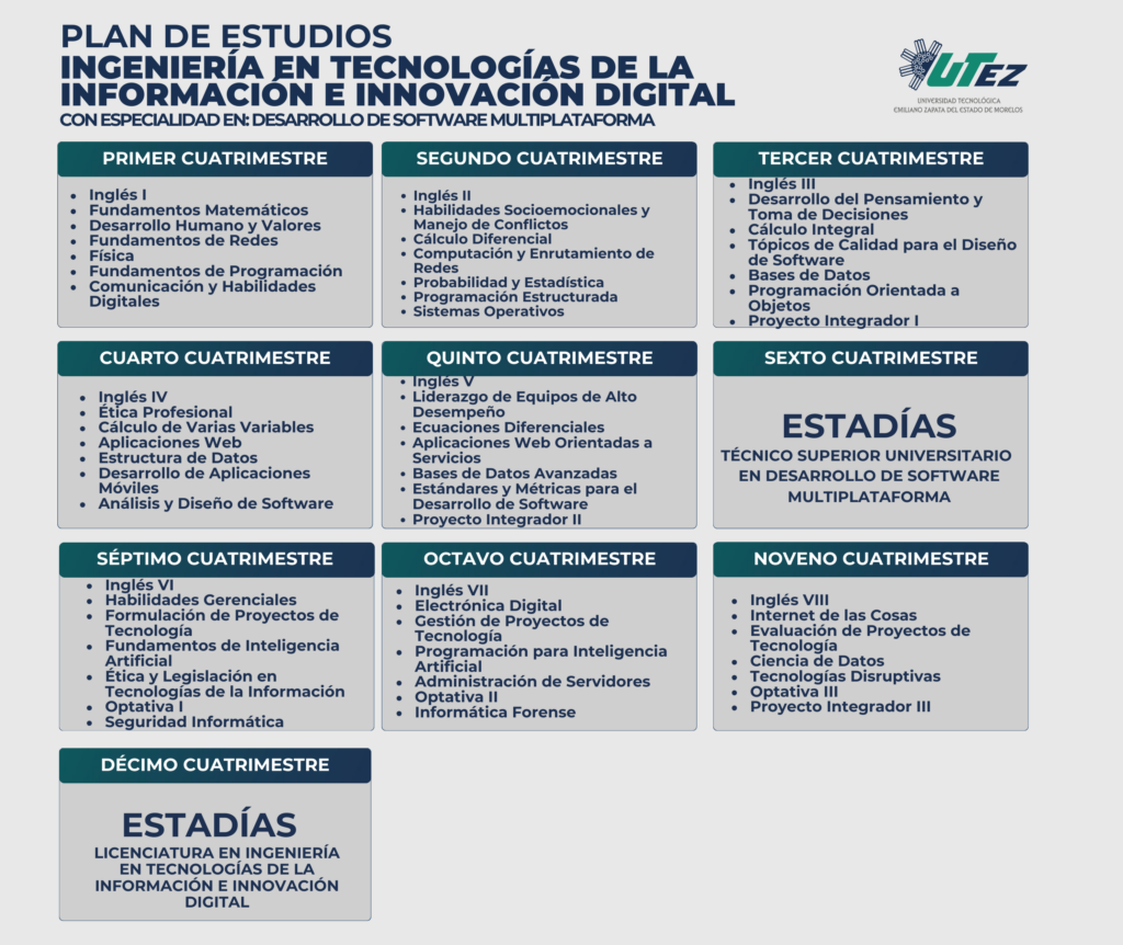 Sé un líder en innovación tecnológica y desarrolla soluciones que definan el futuro. Con la Ingeniería en Tecnologías de la Información e Innovación Digital de la UTEZ, estarás preparado para enfrentar los desafíos de la era digital. ¡Únete a la UTEZ, Territorio de calidad!