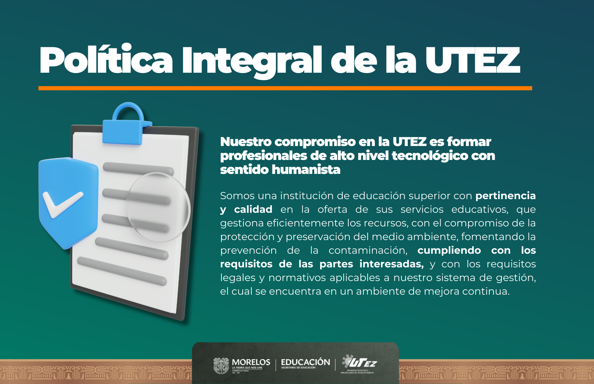 Somos una institución de educación superior con pertinencia y calidad en la oferta de sus servicios educativos, que gestiona eficientemente los recursos, con el compromiso de la protección y preservación del medio ambiente, fomentando la prevención de la contaminación, cumpliendo con los requisitos de las partes interesadas, y con los requisitos legales y normativos aplicables a nuestro sistema de gestión, el cual se encuentra en un ambiente de mejora continua.